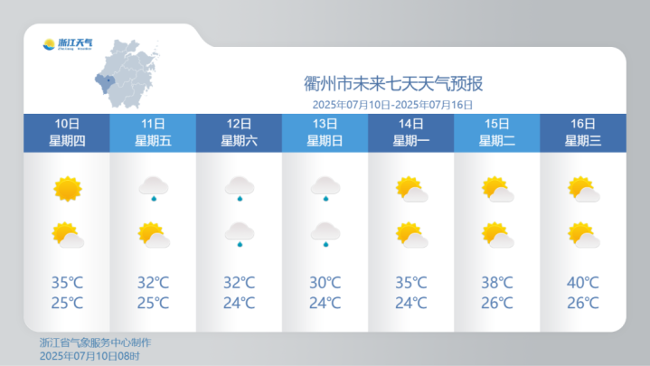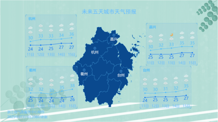 7月14日:浙南地区多云到阴部分有阵雨或雷雨,其它地区多云到晴。