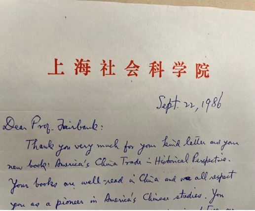 这封带有“上海社会科学院”抬头的信笺,生动而真实地呈现了中美两位学术巨擘的私人交往,文字间流露出的坦诚、平等和友好,也反映了改革开放初期中美学术交往中的主流方式,对理解以学术促进中外文明交流以及深化中国学研究的学术视野等也都有所启发。
